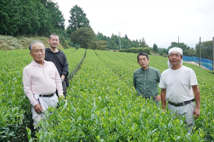 原料の茶葉選びには、静岡県浜松市役所の産業部農業振興課の協力を得て、茶農家の紹介を受けました。星野リゾートのレシピ開発リーダー・浜田統之、界 遠州の総支配人・斎藤高之、同館のお茶のおもてなし開発担当・長谷川滋春が茶畑を訪れ、羊羹の材料となる茶葉の選定を行いました。羊羹作りを前提に、一番理想となる風味にこだわり、候補の中から選んでいます。レシピ開発においては、それぞれのお茶そのもの味わいをいかに引き出すかを考え、餡(あん)の分量を通常のものよりも減らし、茶葉の香りを最大限生かす方法を模索しました。