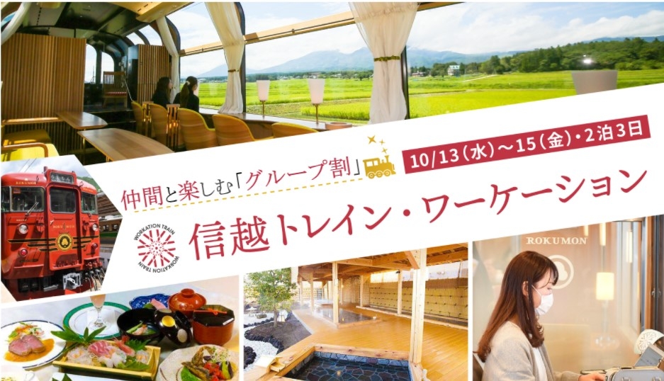 観光列車の平日運行、平日のホテル客室有効利用といった遊休資源を活用したワーケーションを提供するため、長野と新潟の宿、食事、温泉、それぞれの魅力をゆったり堪能できる豪華なプランとなっています。
