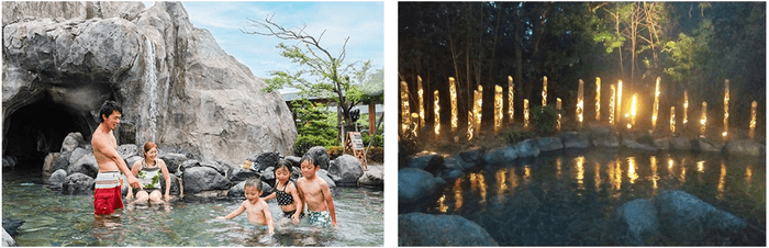 右:大滝の湯を抜けた先にある「竹林の湯」。夜間は竹をくりぬいたライトが柔らかな光で湯面や周囲を照らす、幻想的な雰囲気をお楽しみいただけます。
