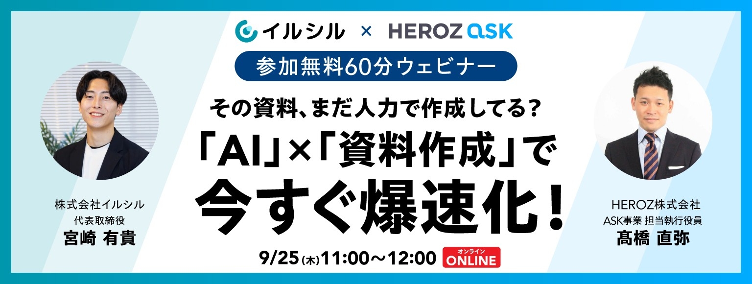 AI搭載スライド自動生成サービス「イルシル」を提供する株式会社イルシル(本社:東京都渋谷区、代表取締役:宮﨑有貴)は、HEROZ株式会社様と共催で、資料作成における生成AI活用の実践ポイントを解説する参加無料の60分ウェビナーを開催します。