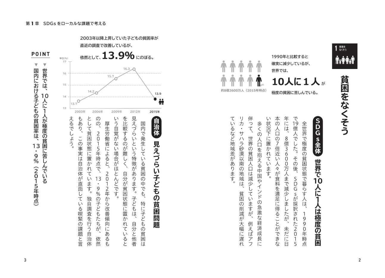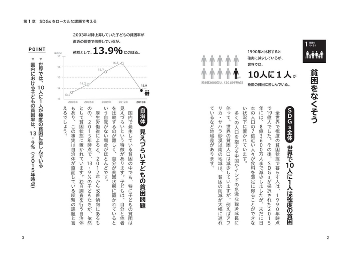 第1章では、SDGsのローカルな課題について図解を交え、1項目=見開き2ページで解説。
