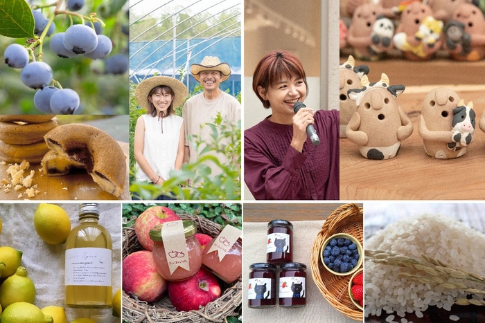 商品一例:りんご・レモン、パプリカ、各種ジャム&ソース類、新米、米粉のおやつセット等。