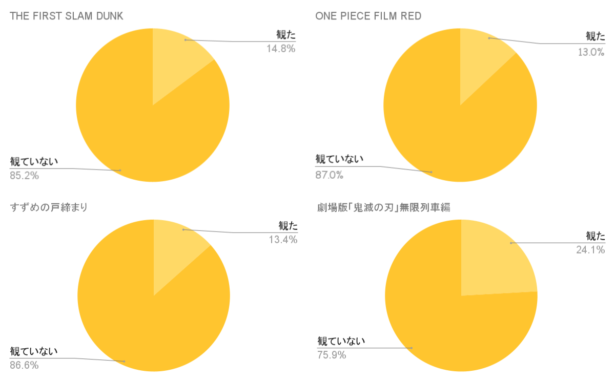 その中でも、鬼滅の刃は25%近くの人が劇場で観ており、アンケート回答者の30代~40代のファン、また子供と一緒に観にいくという背景があったのかもしれない。