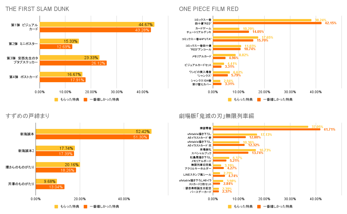 ワンピース、鬼滅の刃では、特典のコミックスやスペシャルブックがもらった特典、嬉しかった特典としても上位にあり、他の映画とはやや異なる結果に。
