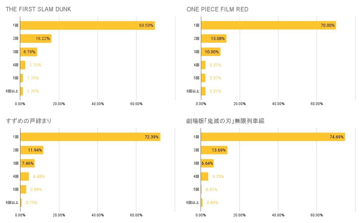 アンケート結果の内、劇場で見た人の結果から多くの人は1回ではあるものの、どの映画についても2回以上観た人が10%を超える結果に。