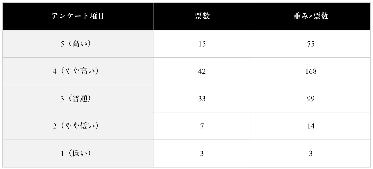 上記のアンケート結果の場合、「75+168+99+14+3」の合計数359を、総票数100で割った結果の「3.59」が点数となります(5点満点)。