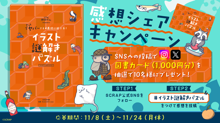①『ヤバいことが最後に起こる! イラスト謎解きパズル』の感想を「#イラスト謎解きパズル」のハッシュタグをつけて、キャンペーン期間内にInstagramまたはXに投稿する。