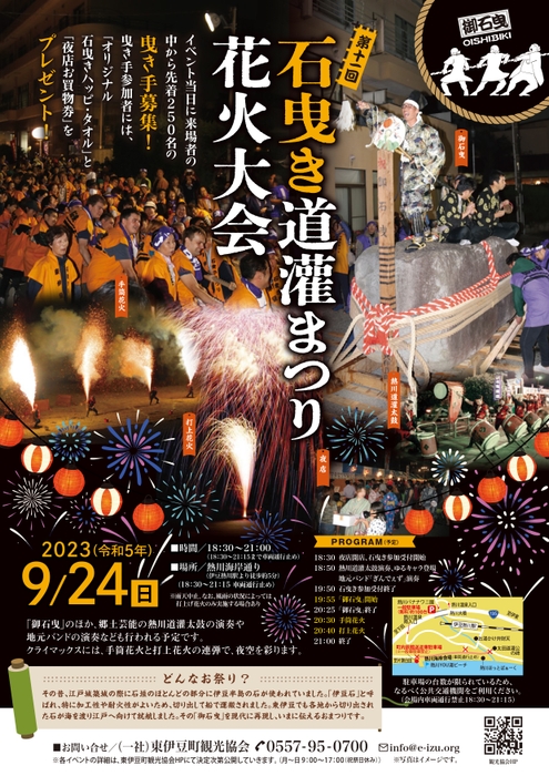 一般社団法人東伊豆町観光協会(所在地:静岡県賀茂郡東伊豆町:代表理事 加藤昌利)は2023年9月24日(日)より、「第11回石曳き道灌まつり花火大会(いしびきどうかんまつりはなびたいかい)」を熱川温泉の海岸通りで開催します。大勢の人達で巨大な築城石の運搬を体験する「御石曳」や東伊豆町のゆるキャラ登場、道灌太鼓や地元バンドの演奏、夜店が出て賑わいます。最後には手筒花火と打上花火がフィナーレを飾ります。