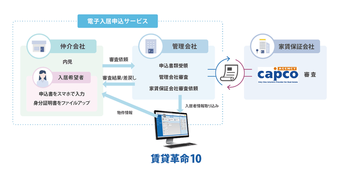 入居申込をオンラインで完結する日本情報クリエイトの「電子入居申込サービス」と CAPCO AGENCY が提携を行うことにより、家賃保証サービスをご利用いただく入居希望者様、仲介会社様、管理会社様はこれまでと比較して、手書きでの保証申込書作成の手間や記載漏れの確認などのストレスが少ない、スムーズな保証審査が可能となります。