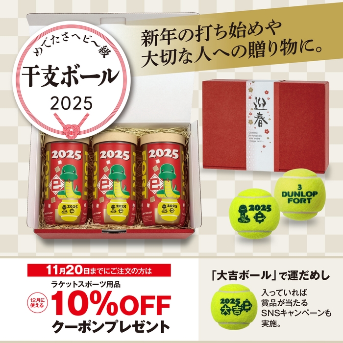 「ダンロップ フォート 干支ボール(2025年「巳」)」には、おみくじ要素を加えた“大吉ボール”※が入っている場合があります。年末年始の打ち納め、初打ち、運試しなどにぜひご活用ください。また、“大吉ボール”が入っていた方を対象に、SNSにてハッシュタグ投稿キャンペーンを実施します。テニスボール福袋が当たりますので、奮って応募ください。