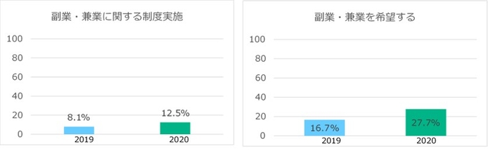 さまざまな雇用形態・業職種を対象とした調査によると、勤務先で「副業・兼業に関する制度導入」が実施されている人の割合は、昨年から4.4ポイント増加し、今年は12.5%。また正社員のうち、副業・兼業を希望する人の割合は、昨年から11ポイント増加して今年は27.7%と副業・兼業についての注目が高まっています。