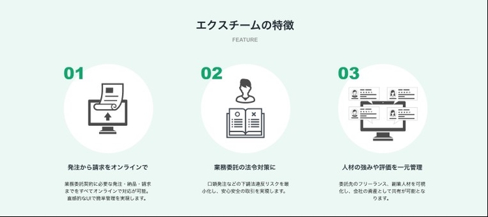 エクスチームは、「社員もフリーランスも、ワンチームで活躍する組織を広めていく」ことをミッションに、外部人材を活用している企業を対象に業務委託先をリスト化し、発注から請求までを一元管理できるサービスです。