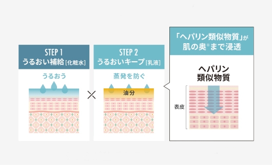 スキンケアで最も重要な"保湿"は2段階に分けられ、1段階目が化粧水で水分を肌に足していくこと。2段階目の乳液で肌を油分の膜で覆うことにより、化粧水で補った水分や美容保湿成分が逃げるのを閉じ込めることができます。