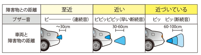 リバースギアに連動して自動的に動作を開始。障害物までの距離に応じて、3段階のブザー音で通知をします。