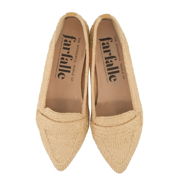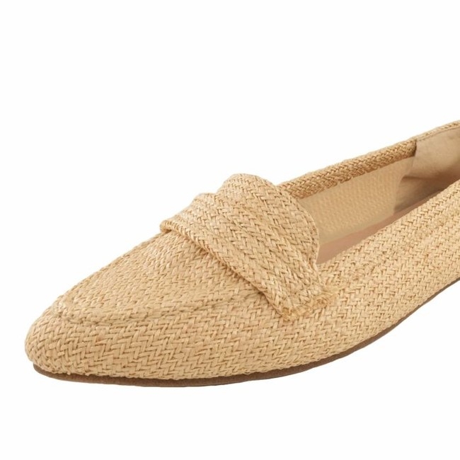 特徴:ラフィア素材のポインテッドローファー、フラットタイプ