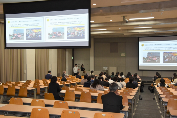 学生たちが課外で多様な学びに取り組む集団活動を支援する「Enjoy Learningプロジェクト」の2024年度の成果報告会が3月5日、天白キャンパスの共通講義棟南で開催されました。全14団体が登壇し、この1年間で取り組んだ活動で得た学びや課題、今後の抱負などを発表しました。