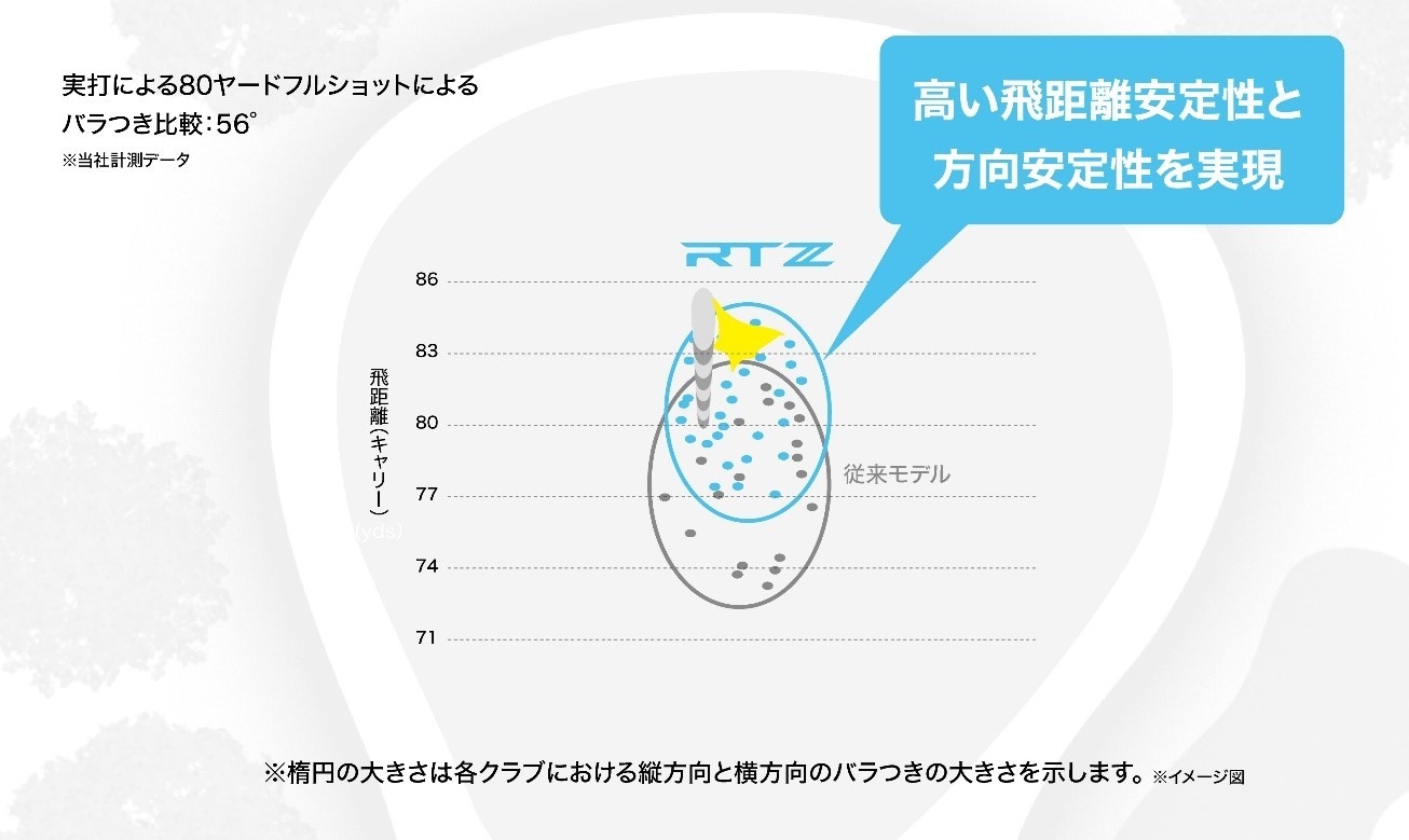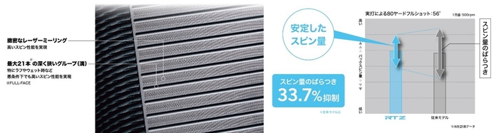 また、高精度で設計された最大21本※3の深く狭い(溝)「ULTIZIP」が強烈なスピンを生み出し、特にラフやウエット時など悪条件下でも優れたスピンコントロール性能を発揮。新素材「Z-ALLOY」と「HYDRAZIP」「ULTIZIP」の効果により、高い次元でスピン量の安定化を実現します。