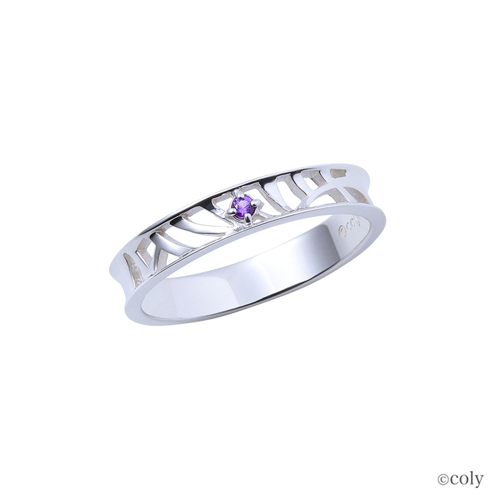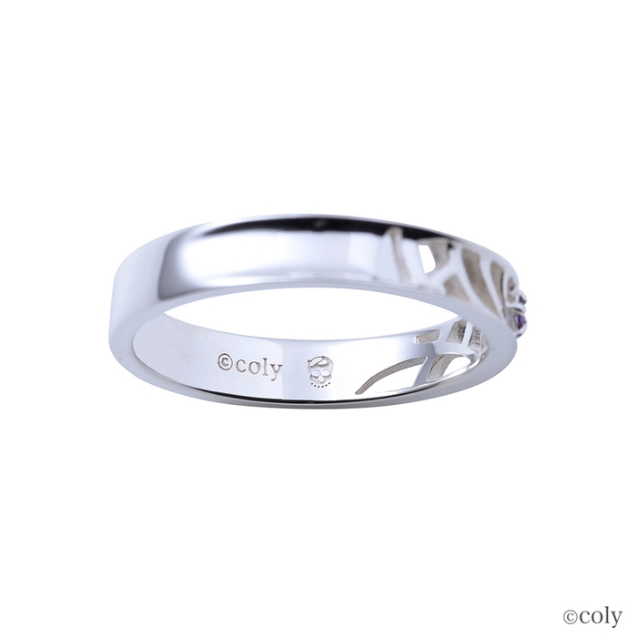 「魔法使いの約束」に登場する北の国の魔法使い、ミスラをイメージしたシルバーリングです。ミスラの腕輪をモチーフとしてリングに取り込んだ平打ちタイプのデザインに、イメージカラーストーンをセット。内側には魔道具のアイコンを刻印しました。透かしの柄が上品に身に着けられるデザインです。