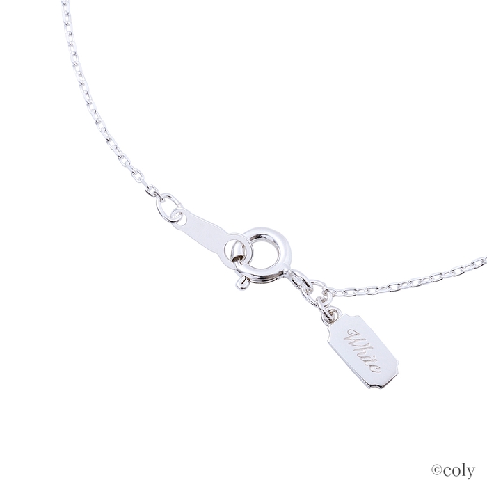 「魔法使いの約束」に登場する北の国の魔法使い、ホワイトをイメージしたシルバーネックレスです。衣装の柄をモチーフにしたデザインに、イメージカラーストーンをセット。エンドチャームのプレートには名前を刻印しました。スノウとお揃いのデザインです。