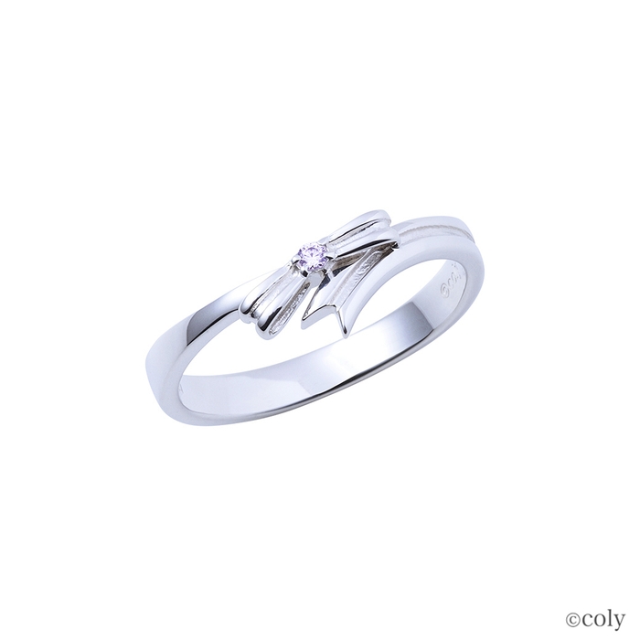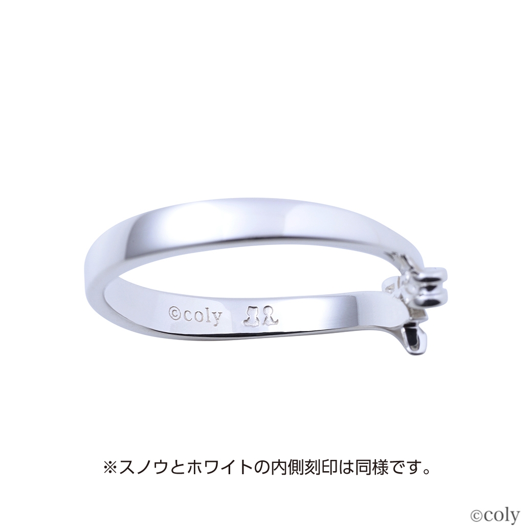 「魔法使いの約束」に登場する北の国の魔法使い、ホワイトをイメージしたシルバーリングです。衣装のリボンをモチーフとしてリングに取り込んだV字タイプのデザインに、イメージカラーストーンをセット。内側には魔道具のアイコンを刻印しました。スノウのリングとお揃いのデザインです。