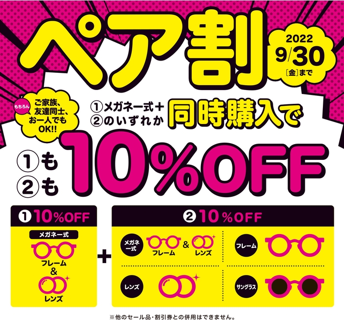メガネ一式にプラスして、メガネ一式、フレーム、レンズ、サングラスのいずれかを同時にお買い上げいただくと、合計の金額から10%を割引いたします!
