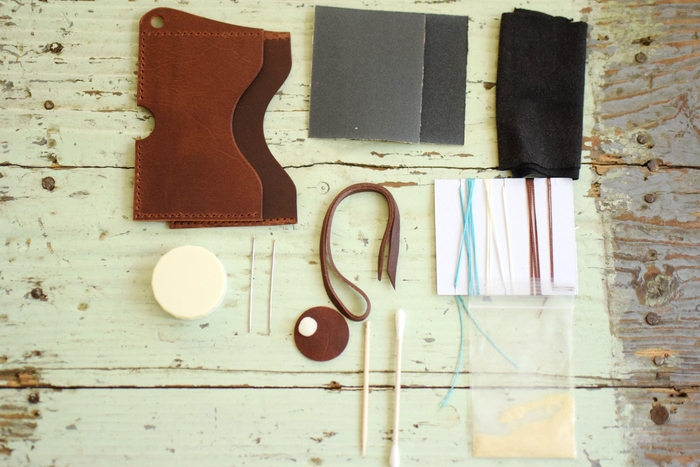 お申込みいただきますと、革のパスケースの材料と道具一式をお送り致します。