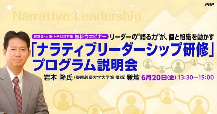 株式会社PHP研究所(京都市南区・代表取締役社長 瀬津要)は、企業の管理職を対象にした「ナラティブリーダーシップ研修」のプログラムを開発しました。人的資本経営の第一人者、慶應義塾大学大学院経営管理研究科講師・岩本隆氏の全面監修により、「物語る力(ナラティブ)」を修得し、リーダー自身の経験や価値観を通してミッションやビジョンを伝えるコミュニケーション力を高める実践的プログラムとなっています。リリースを記念して、2025年6月20日(金)、岩本隆氏が登壇する基調講演とプログラム説明会をウェビナー形式で開催します。