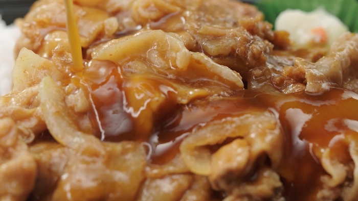 豚生姜焼き弁当と同様に、りんご/はちみつ/生姜のきいた、従来の約2倍サイズの別添の秘伝の「タレ」を使用 しています。「タレ」が絡むようチャーシューの厚さをあえて薄くスライス。お米はあっさりした味わいの北海道産ななつぼしのブレンド米を使用。「タレ」とともに食感を楽しめるよう付け合わせに甘辛のタケノコ、お米の上にはたくあん、もやしをトッピングし、食感のメリハリを出しました。