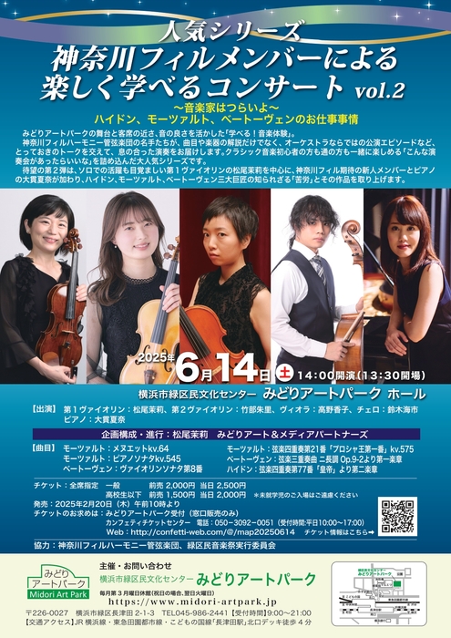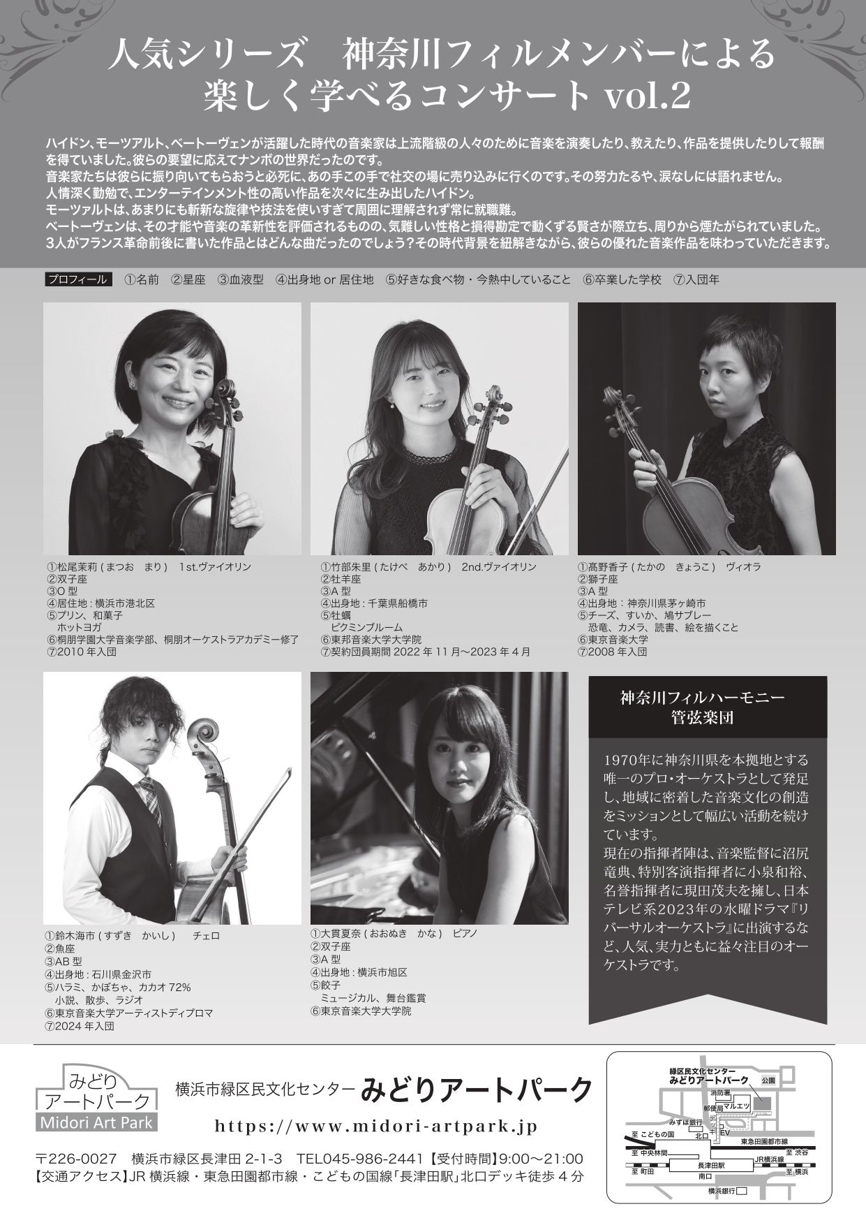 みどりアート&メディアパートナーズ主催、『神奈川フィルメンバーによる楽しく学べるコンサートvol.2』が2025年6月14日 (土)に横浜市緑区民文化センター みどりアートパーク(神奈川県 横浜市緑区 長津田 二丁目1番3号)にて開催されます。