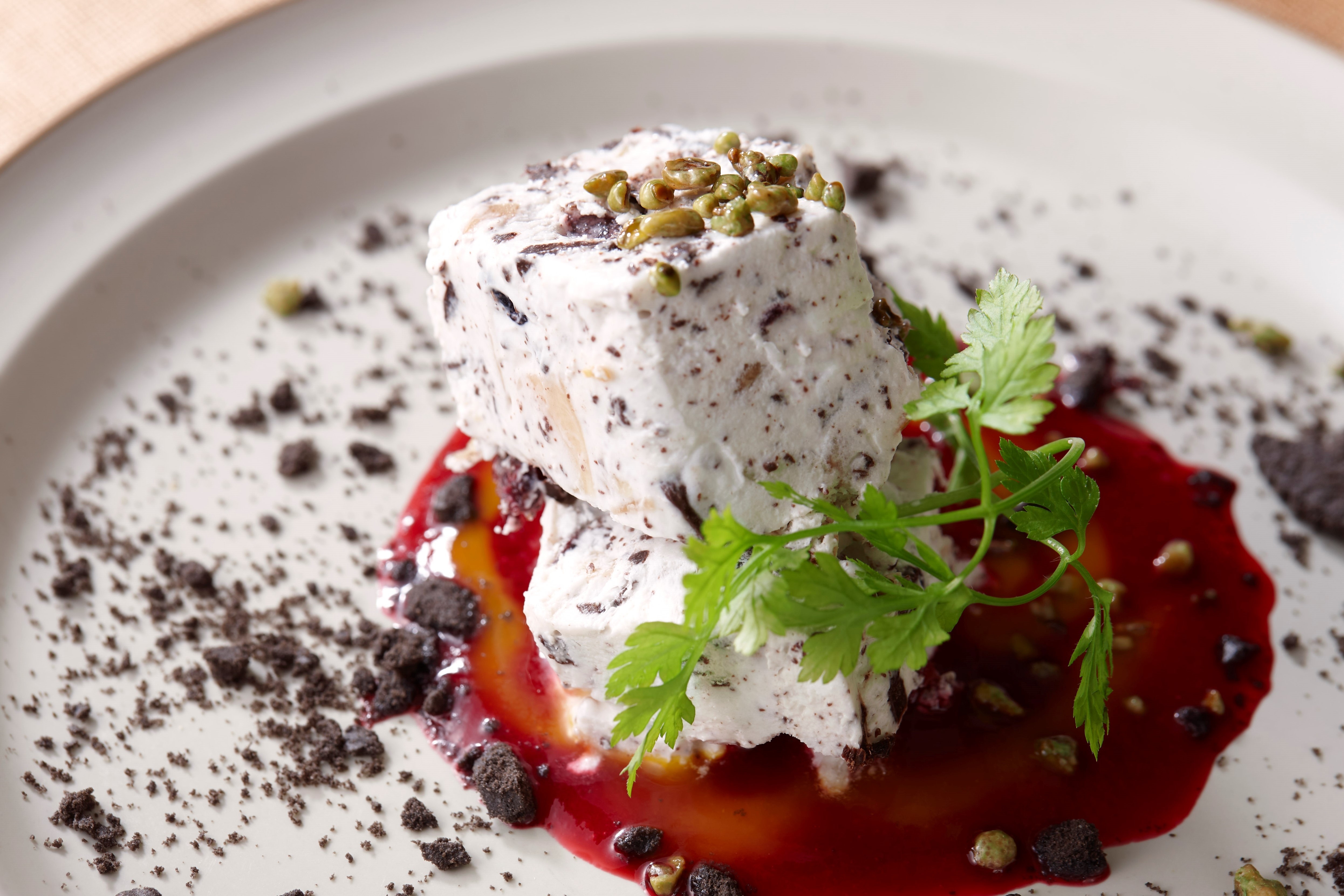 ドライフルーツとナッツをチーズクリームに混ぜ込み凍らせたイタリアの伝統菓子。ベリーとマンゴーのソースを絡ませると爽やかな酸味がプラスされ、コースをすっきりと締めくくります。