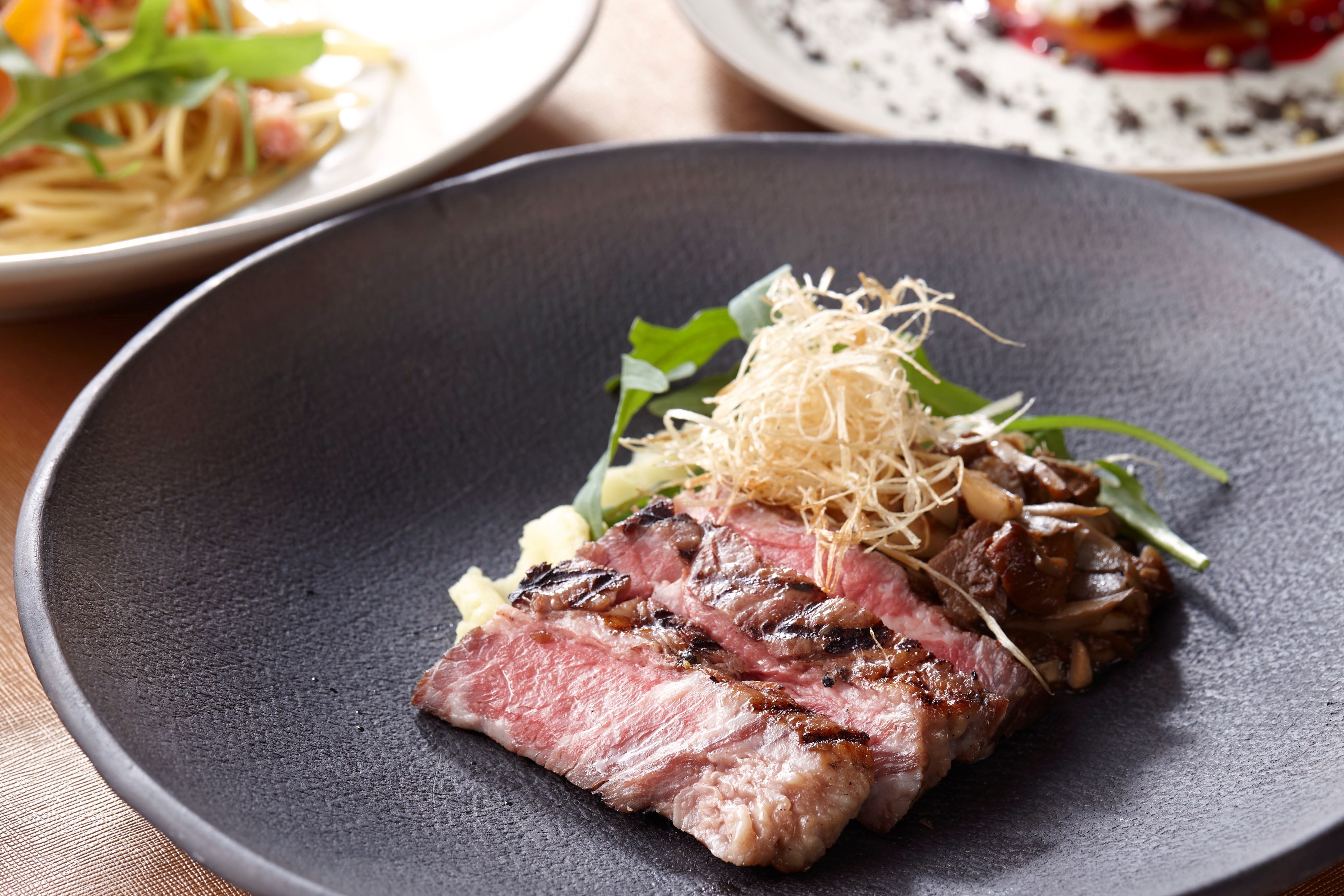 “香りの女王”と言われるほど濃厚な香りと味わいを持つポルチーニ茸を添えたメインディッシュ、熟成牛のステーキ。トップにあしらった葱フリットのクリスピーな食感と香ばしさが相まって、満足感が高まる一皿に仕上げました。
