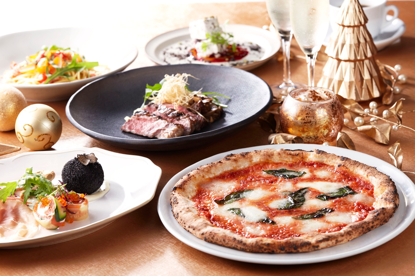 心躍る聖夜にぴったり!トリュフや紅ズワイ蟹、ポルチーニ茸など旬の味覚をあしらった前菜、パスタ、メインディッシュ、さらに自慢の窯焼きピッツァもご堪能いただける全5皿のスペシャルコースを12月21日(水)から25日(日)までの5日間限定でお楽しみいただけます。赤、白、緑のクリスマスカラーの彩りで、目で見ても楽しめるサルヴァトーレらしいイタリアンクリスマスコースです。コース料理はお好きなものをシェアして楽しめるアラカルトでもご用意。大切な方やご友人、ご家族と心に残る素敵な一夜をお過ごしください。