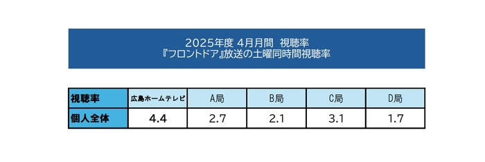 「フロントドア」2025年4月月間視聴率 同時間帯1位を獲得!【広島ホームテレビ】