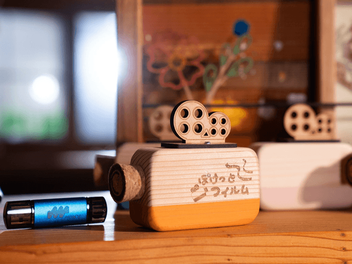 500年以上の歴史をもつ吉野林業で育てられた吉野杉を使用。奈良県葛城市の木工作家 SUGGY(スッギー) 氏が、昔の8ミリフィルムカメラをモチーフにデザイン。木とふれあいを通じて心を育む「木育」の考えを取り入れました。