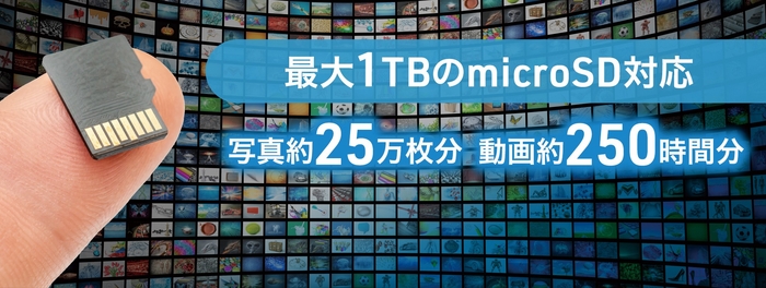 ※保存可能なデータ数は理論上の数値です。アプリケーションの仕様によってはファイル数の認識に上限がある場合があります。右記の条件で算出しています。写真:約4MB/枚(高画質JPEGの場合)、動画:約4GB/本(フルHD,1時間の場合)※1TBのmicroSDカードは規格上対応していますが、すべてのカードとの互換性を保証するものではありません。