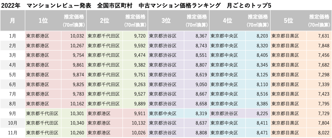 1~8月は港区が1位であったが、9月以降は千代田区が1位に。10・11月は両区とも推定価格が1億円を突破。3位は9月のみ中央区であったが、その他の月は渋谷区。目黒区は1~11月で5位をキープ。