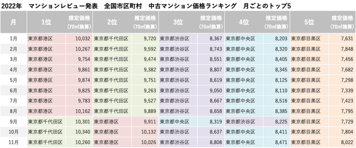 「マンションレビュー」のプレスリリースで注目エリアの1年を振りかえり! 2022年中古マンション価格ランキング、トップ5区での町名別推定価格を調査