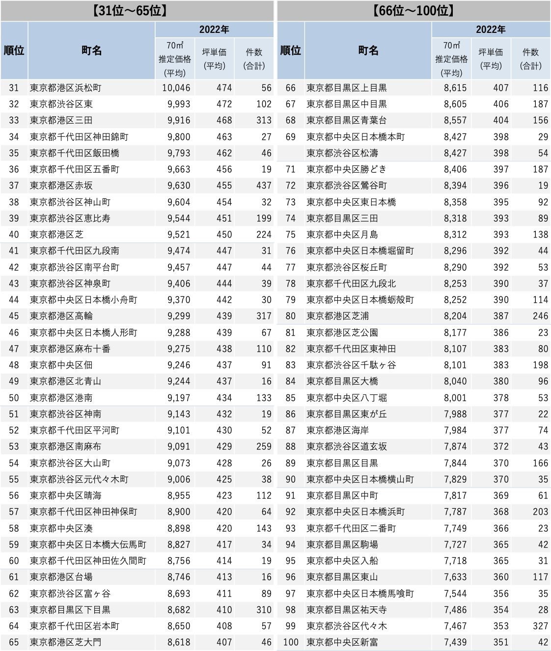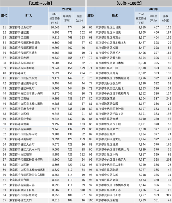 ※町名ランキングは、東京都千代田区・中央区・港区・目黒区・渋谷区の5区内で、2022年1~12月の販売物件数が15件以上ある128町名を対象に作成。