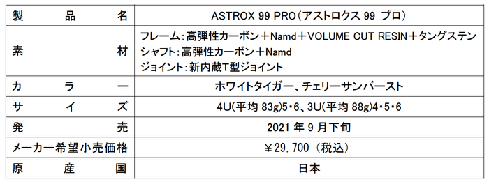 ヨネックス株式会社(代表取締役社長:林田 草樹)は、世界のトップ選手たちが信頼をよせているASTROXシリーズから、さらにショットの威力と球持ちが向上したバドミントンラケット上級者、選手層向け「ASTROX 99 PRO」、中級者向け「ASTROX 99 GAME」を2021年9月下旬より発売いたします。