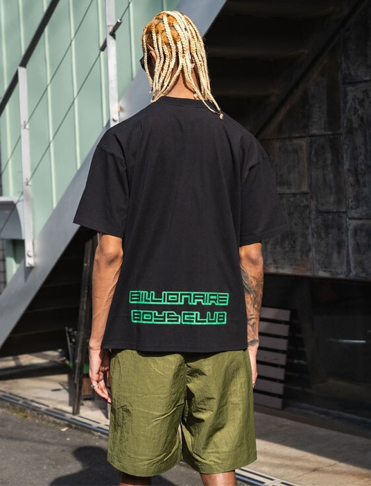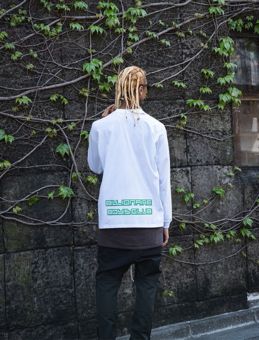 WATERMELONHEADらしいカラーリングとBillionaireBoysClubのストリートとラグジュアリーを融合させたスタイルを活かしたデザイン。フロント左胸にはBillionaireBoysClubを象徴するHELMETロゴをモノトーンカラーでプリントし、バックにはBillionaireBoysClubのブランドロゴをWATERMELONHEADのブランドカラーであるグリーンでプリントを施している。ロングスリーブ、ショートスリーブともにホワイト/ブラックの2色展開。