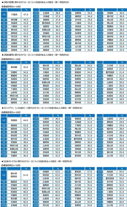 都道府県別にみると、【家計管理に関するリテラシー】では、自信がある人の割合が最も高くなったのは千葉県で、東京都、青森県が続きました。【資産運用に関するリテラシー】では、自信がある人の割合が最も高くなったのは東京都、京都府と愛媛県の順となりました。【ライフプラン(人生設計)に関するリテラシー】では、自信がある人の割合が最も高くなったのは青森県となり、福島県、群馬県、東京都が続きました。