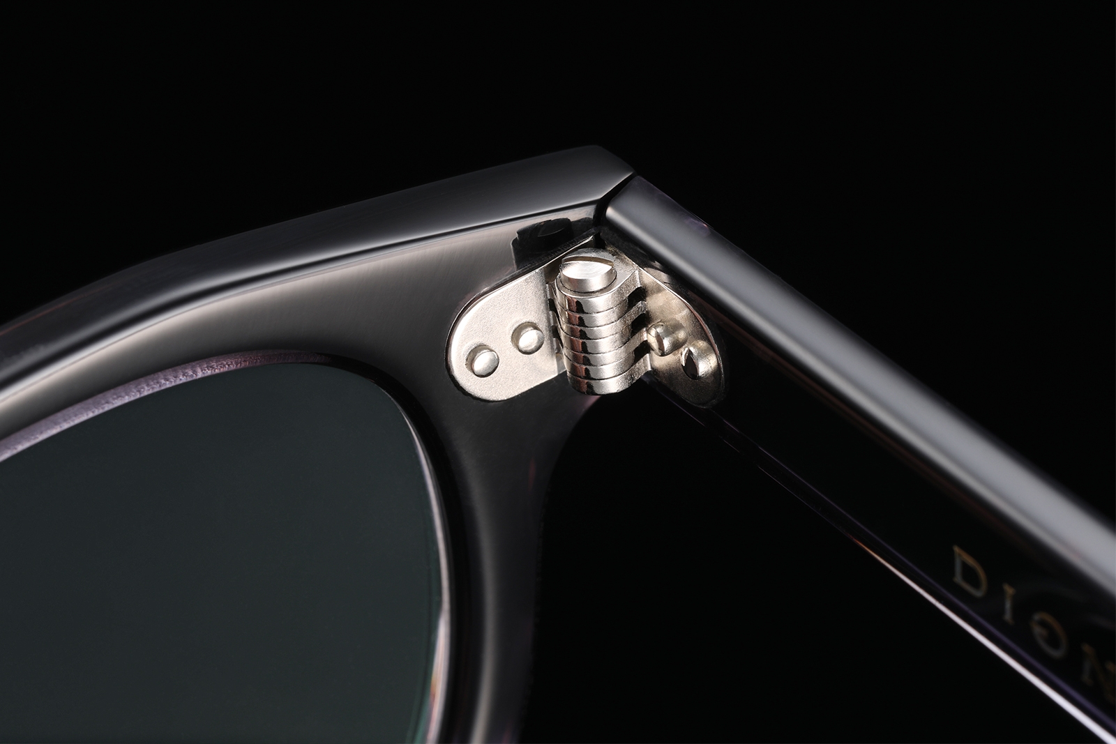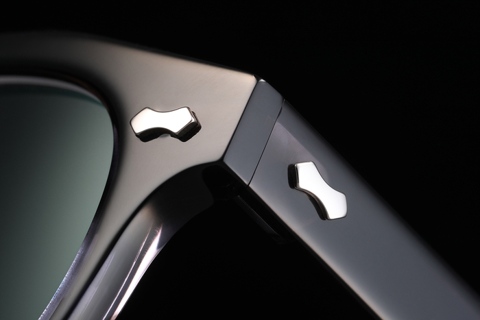 本格的なカシメ留めを行なったフロント、テンプルのリベットは、腐食しにくいサンプラチナ製で別注した。セルロイドの素材硬度を生かしたテンプル芯を排除した”ノー芯”、左バチ先のブランドアイコン”カブト”もインレットにて投入されている。