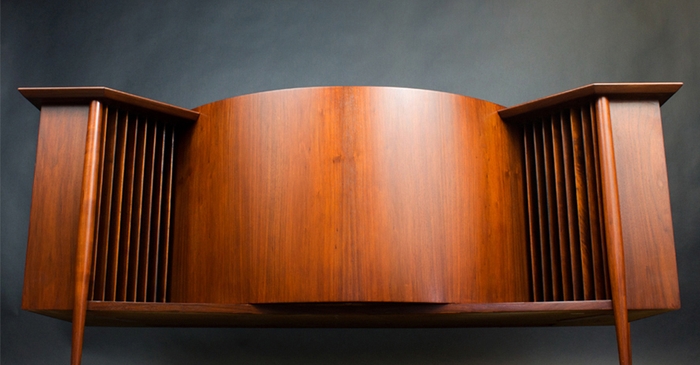 メトロゴンは、1958年から1970年にかけてアメリカのJBL社から販売された左右一体型のスピーカーです。ボックスは2組のスピーカーシステムが一体となった構造で、中央に半円型の反射パネルを設け、音を反射させるリスニングエリアを確保しています。重さも80キロ超で500リットルクラスの冷蔵庫を横倒しにした位の大きさです。