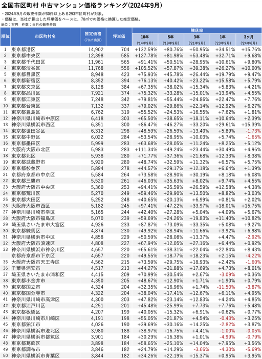 全国市区町村 中古マンション騰落率ランキング(2024年9月_3・5・10年前比較)
