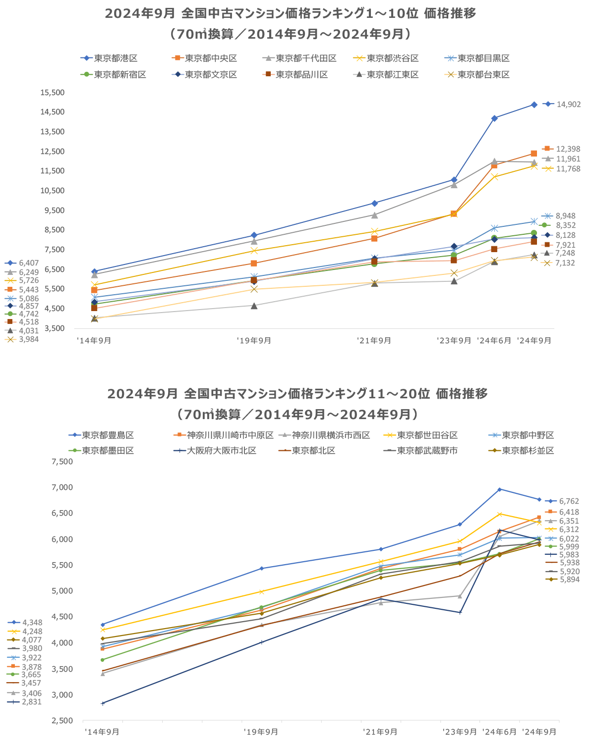 「不動産×WEB×ビッグデータ」の領域で、さまざまな不動産テックサービスを展開する株式会社ワンノブア カインド(本社:東京都港区、代表取締役社長:川島 直也、以下当社)は、当社が運営するマンション情報サイト 「マンションレビュー」の保有データを元に、2024年9月の全国市区町村における中古マンションの相場を 調査。坪単価をベースに70m²の価格に換算した「中古マンション価格」*1 と価格ランキング上位20件について 過去10年間の価格推移、および1年前からの価格上昇率を表す「騰落率」のランキングを発表いたします。