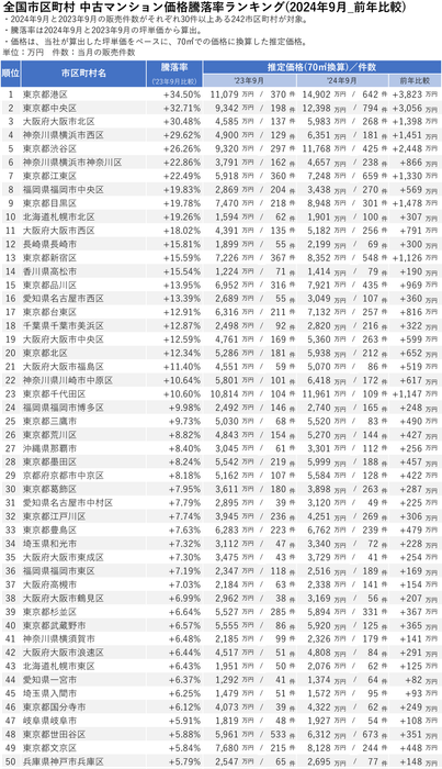 全国市区町村 中古マンション価格騰落率ランキング(2024年9月_前年比較)