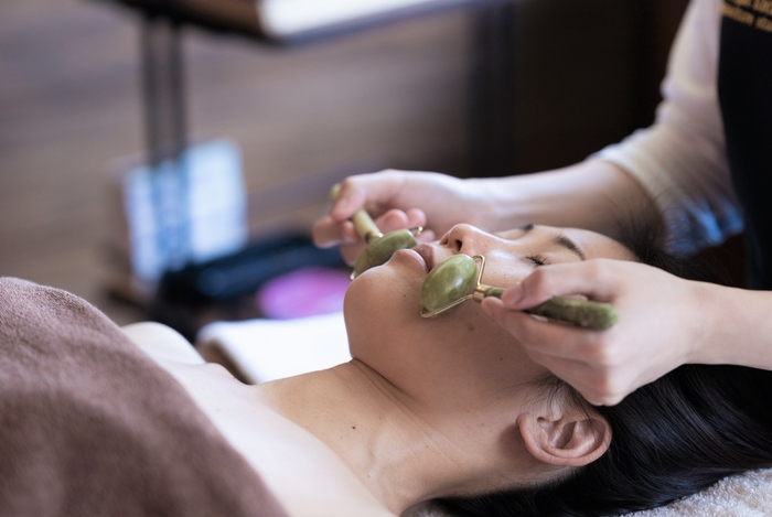 お顔の緊張をほぐし、表情をやわらかくする美顔はりに加え、目的に応じて選ぶ県産自然素材のデコルテ、フェイシャルパックを行い、強い紫外線を受けたお肌をケアし守ります。