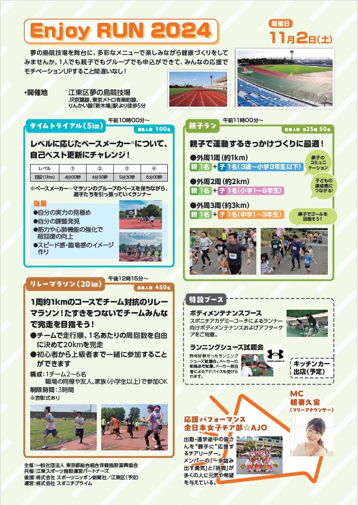 一般社団法人東京都総合組合保健施設振興協会が毎年秋に実施する「いきいき健康づくり」のプログラムの一つ、スポニチ後援「Enjoy Run2024」が11月2日に夢の島競技場で開催。公式サイトで参加者を募集しています。