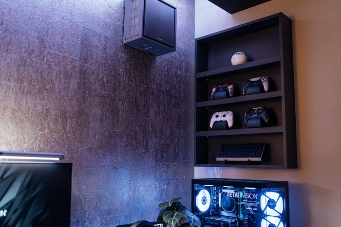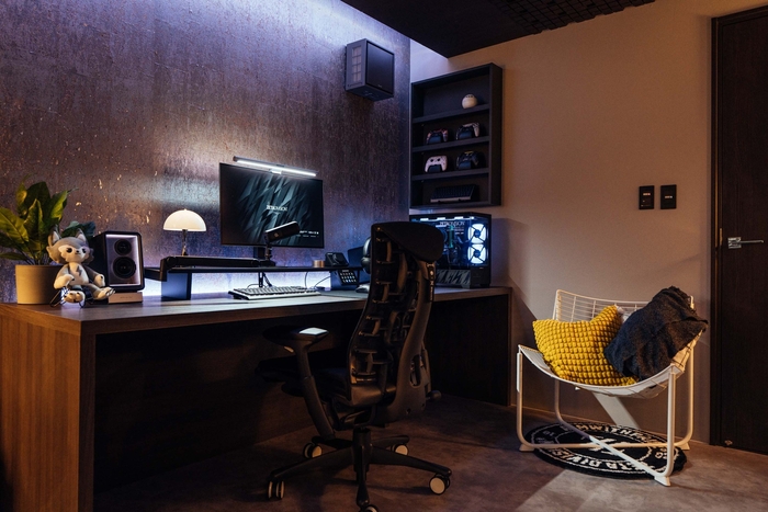 私たちは、そうした社会背景を踏まえ「暮らしの中に溶け込むゲーミング空間」をテーマに、快適性と機能性を兼ね備えた新たな住空間を設計しました。遮音性や収納性、照明演出といったハード面はもちろん、プレイ中の集中・リラックスの切り替えや、家族や仲間と共に楽しむシーンまでを見据えた設計思想を反映しています。