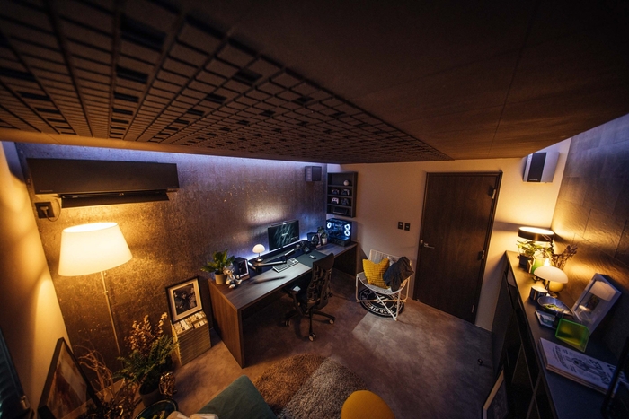 壁・天井・ドアに至るまでホームシアターにも用いられる高密度防音材を使用。外部への音漏れや生活音の侵入を抑制し、昼夜を問わずゲームや配信、ボイスチャットに集中できる環境を実現しました。
